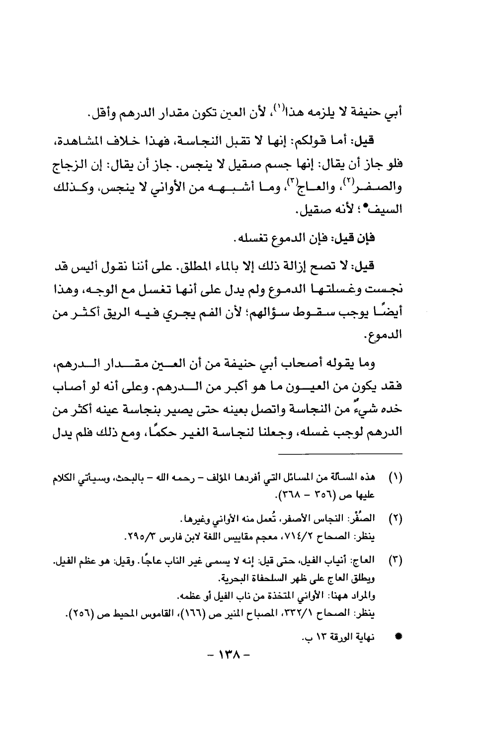 وما يقوله أصحاب أبي حنيفة من ا، العين مقدار الدرهم، فقد يكون من العيون ما هو اكبر من الدرهم، وعلى أنه لو أصاب خده شيء من النجاسة واتصل بعينه حتى يصير بنجاسة عينه أكثر من الدرهم لوجب غسله، وجعلنا لنجاسة الغير حكماً، ومع ذلك فلم يدل
