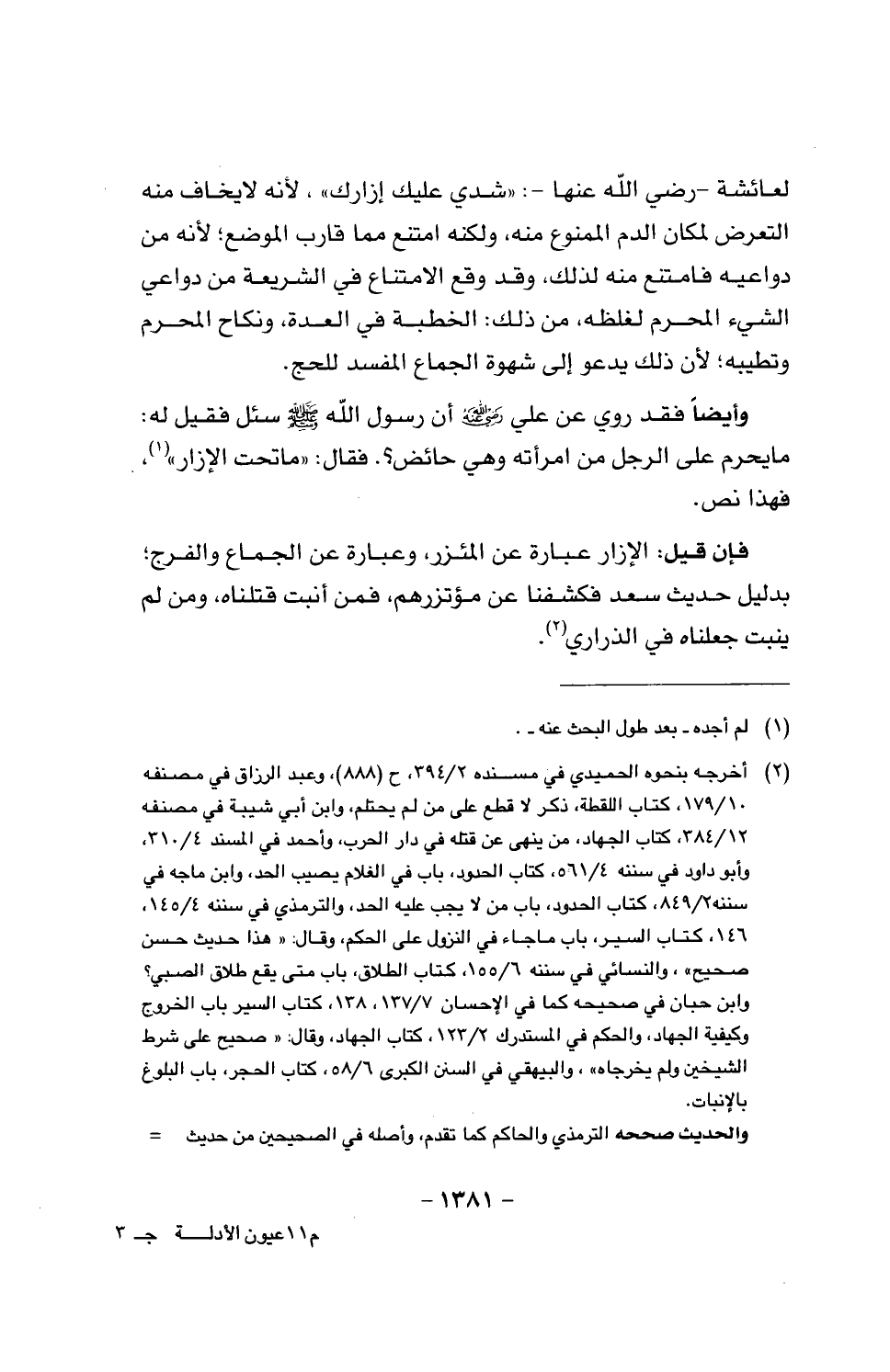 وأيضا فقد روي عن علي رضي الله عنه، رسول الله صَلَّى اللَّهُ عَلَيْهِ وَسَلَّمَ سئل فقيل له: ما يحرم على الرجل من امرأته وهي حائض؟. فقال: «ما تحت الإزار»، فهذا نص.
