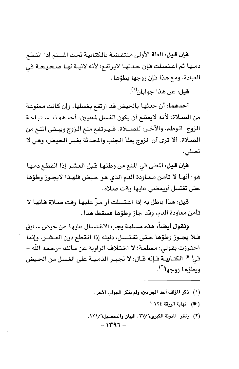 فإن قيل: العلة الأولى منتقضة بالكتابية تحت المسلم إذا انقطع دمها ثم اغتسلت فإن حدثها لا يرتفع؛ لأنه لا نية لها صحيحة في العبادة، ومع هذا فإن زوجها يطؤها.