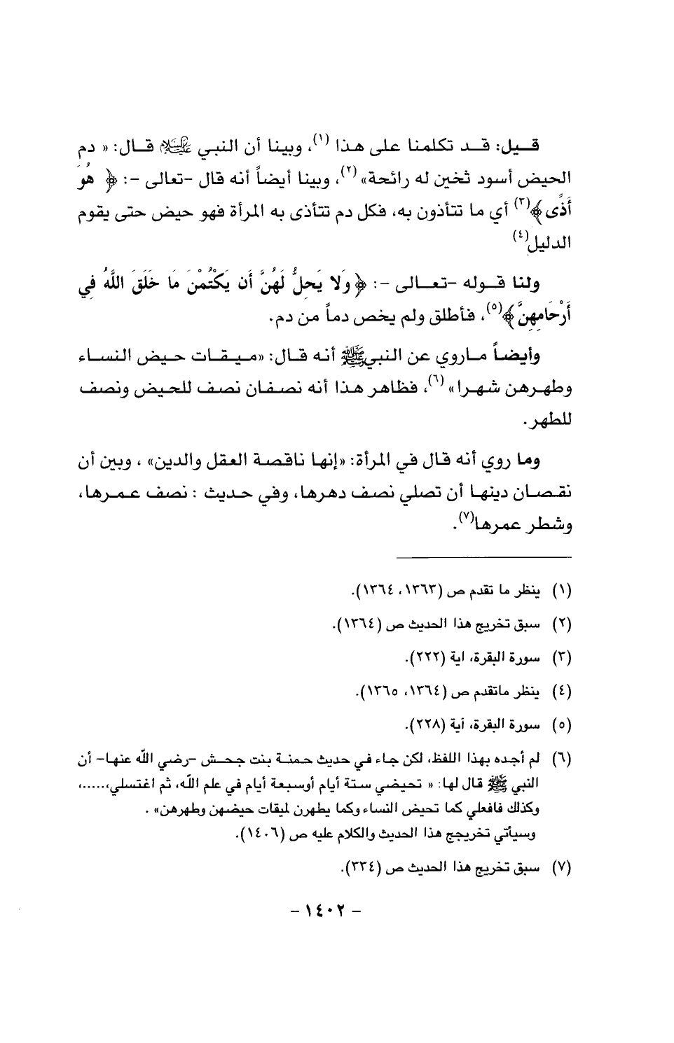 وما روي أنه قال في المرأة: «إنها ناقصة العقل والدين»، وبين أن نقصن دينها أن تصلي نصف دهرها، وفي حديث: نصف عمرها، وشطر عمرها.