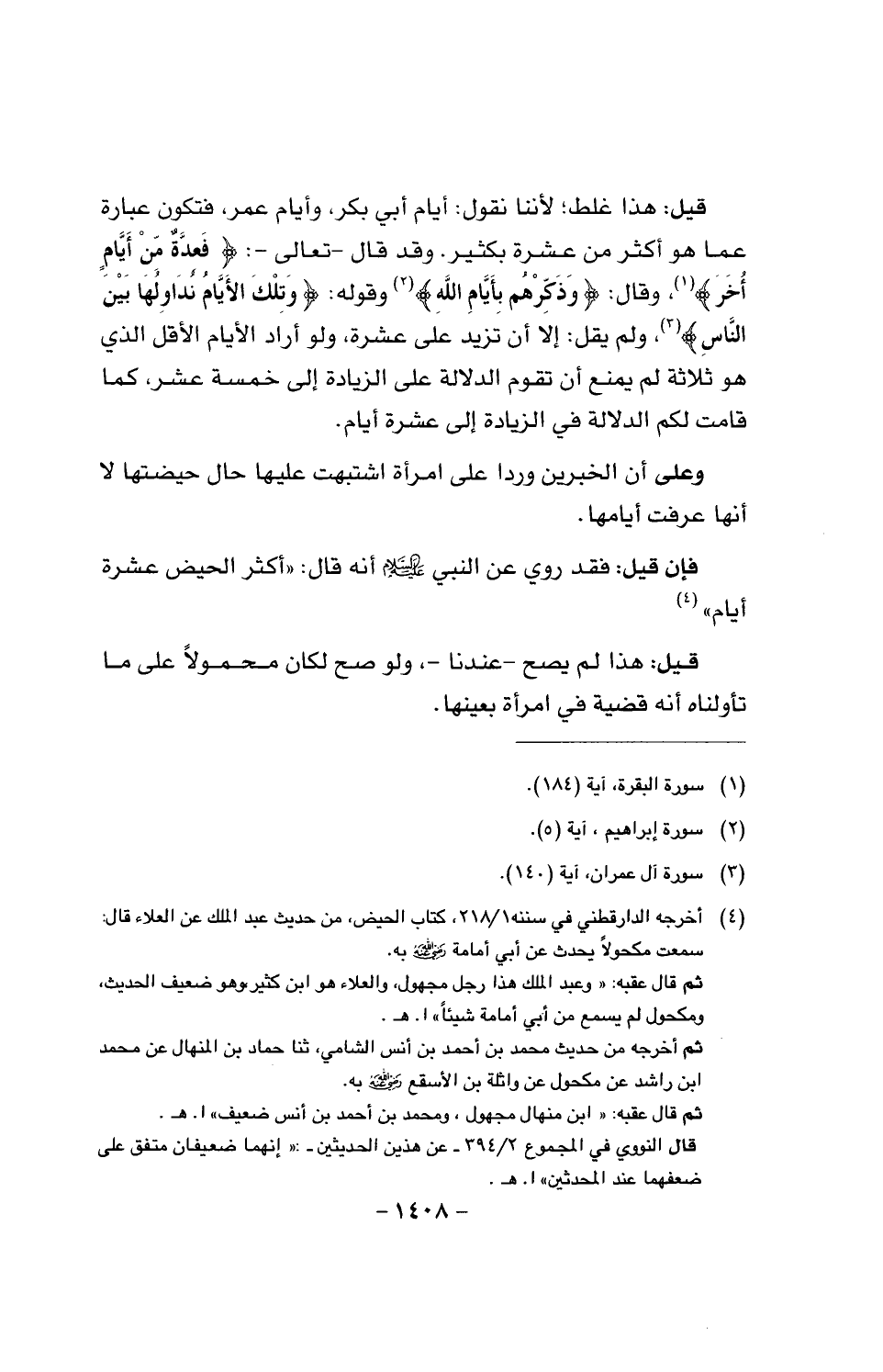 قيل: هذا غلط؛ لأننا نقول: أيام أبي بكر، وأيام عمر، فتكون عبارة عما هو أكثر من عشرة بكثير. وقد قال - تعالى -: {فعدة من أيام أخر}، وقال: {وذكرهم بأيام الله} وقوله: {وتلك الأيام نداولها بين الناسء، ولم يقل: إلا أن تزيد على عشرة، ولو أراد الأيام الأقل الذي هو ثلاثة لم يمنع أن تقوم الدلالة على الزيادة إلى خمسة عشر، كما قامت لكم الدلالة في الزيادة إلى عشرة أيام.