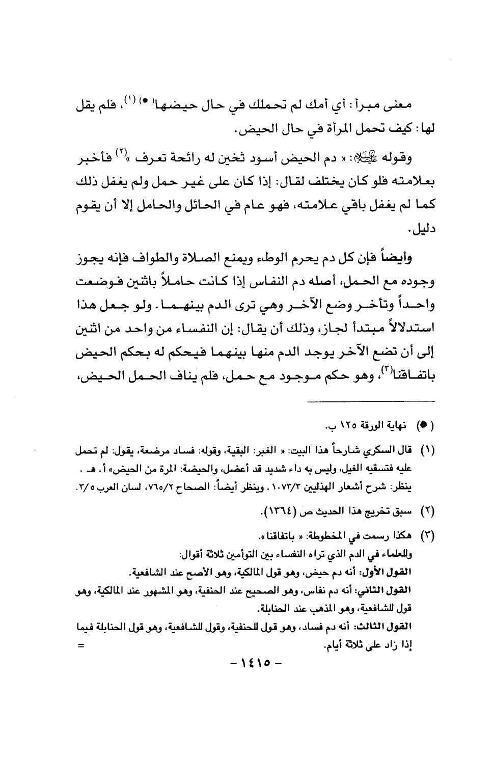 وقوله عليه السلام: «دم الحيض أسود ثخين له رائحة تعرف» فأخبر بعلامته فلو كان يختلف لقال: إذا كان على غير حمل ولم يغفل ذلك كما لم يغفل باقي علامته، فهو عام في الحائل والحامل إلا أن يقوم دليل.