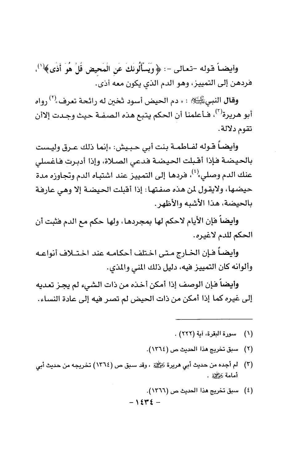 وقال النبي عليه السلام: «دم الحيض أسود ثخين له رائحة تعرف»، رواه أبو هريرة، فأعلمناه أن الحكم يتبع هذه الصفة حيث وجدت إلا أن تقوم دلالة.