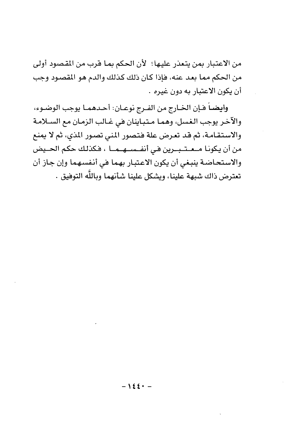 وأيضا فإن الخارج من الفرج نوعان: أحدهما يوجب الوضوء، والآخر يوجب الغسل، وهما متباينان في غالب الزمان مع السلامة والاستقامة، ثم قد تعرض علة فتصور المني تصور المذي، ثم لا يمنع من أن يكونا معتبرين في أنفسهما، فكذلك حكم الحيض والاستحاضة ينبغي أن يكون الاعتبار بهما في أنفسهما وإن جاز أن تعترض ذلك شبهة علينا، ويشكل علينا شأنهما وبالله التوفيق.