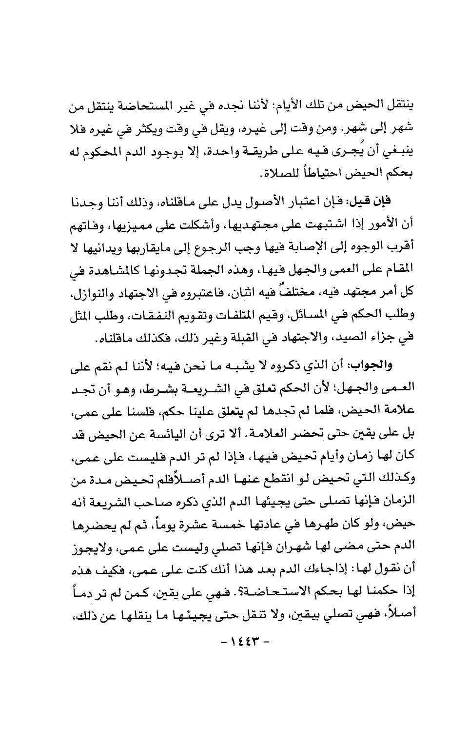 والجواب: أن الذي لا ذكروه لا يشبه ما نحن فيه؛ لأننا لم نقم على العمى والجهل؛ لأن الحكم تعلق في الشريعة بشرط، وهو أن تجد علامة الحيض، فلما لم تجدها لم يتعلق علينا حكم فلسنا على عمى، بل على يقين حتى تحضر العلامة. ألا ترى أن اليائسة عن الحيض قد كان لها زمان وأيام تحيض فيه، فذا لم ترم الدم فليست على عمى، وكذلك التي تحيض لو انقطع عنها الدم أصلا فلم تحيض مدة من الزمان فإنها تصلى حتى يجيئها الدم الذي ذكره صاحب الشرعية أنه حيض، ولو كان طهرها في عادتها خمسة عشر يوما، ثم لم يحضرها الدم حتى مضى لها شهران فإنها تصلي وليس على عمى، لا يجوز أن نقلو لها: إذا جاءك الدم بعد هذا أنك كنت على عمى، فكيف هذا إذا حكمنا لها حكم الاستحاضة؟. فهي على يقين، كمن لم تر دما أصلا، فهي تصلي بيقين، ولا تنقل حتى يجيئها ما ينقلها عن ذلك،