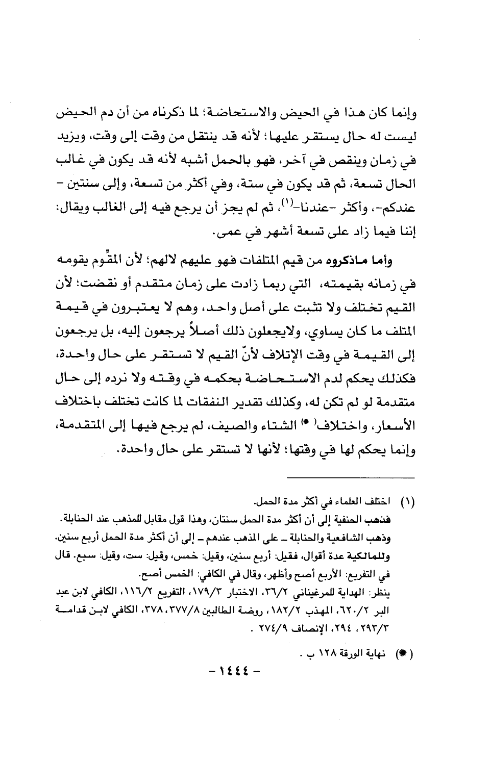 وأما ما ذكروه من قيم المتلفات فهو عليهم لا لهم؛ لأن المقوم يقومه في زمانه بقيمته، التي ربما زادت على زمان متقدم أو نقضت؛ لأن القيم تختلف ولا تثبت على أصل واحد، وهم لا يعتبرون في قيمة المتلف ما كان يساوي، لا يجعلون ذلك أصلا يرجعون إليه، بل يرجعون إلى القيمة في وقت الإتلاف لأن القيم لا تستقر على حال واحدة، فكذلك يحكم لدم الاستحاضة بحكمه في وقته ولا نرده إلى حال متقدمة لو لم تكن له، وكذلك تقدير النفقات لما كانت تختلف باختلاف الأسعار، واختلاف الشتاء والصيف، لم يرجع فيها إلى المتقدمة، وإنما يحكم لها في وقتها؛ لأنها لا تستقر على حال واحدة.