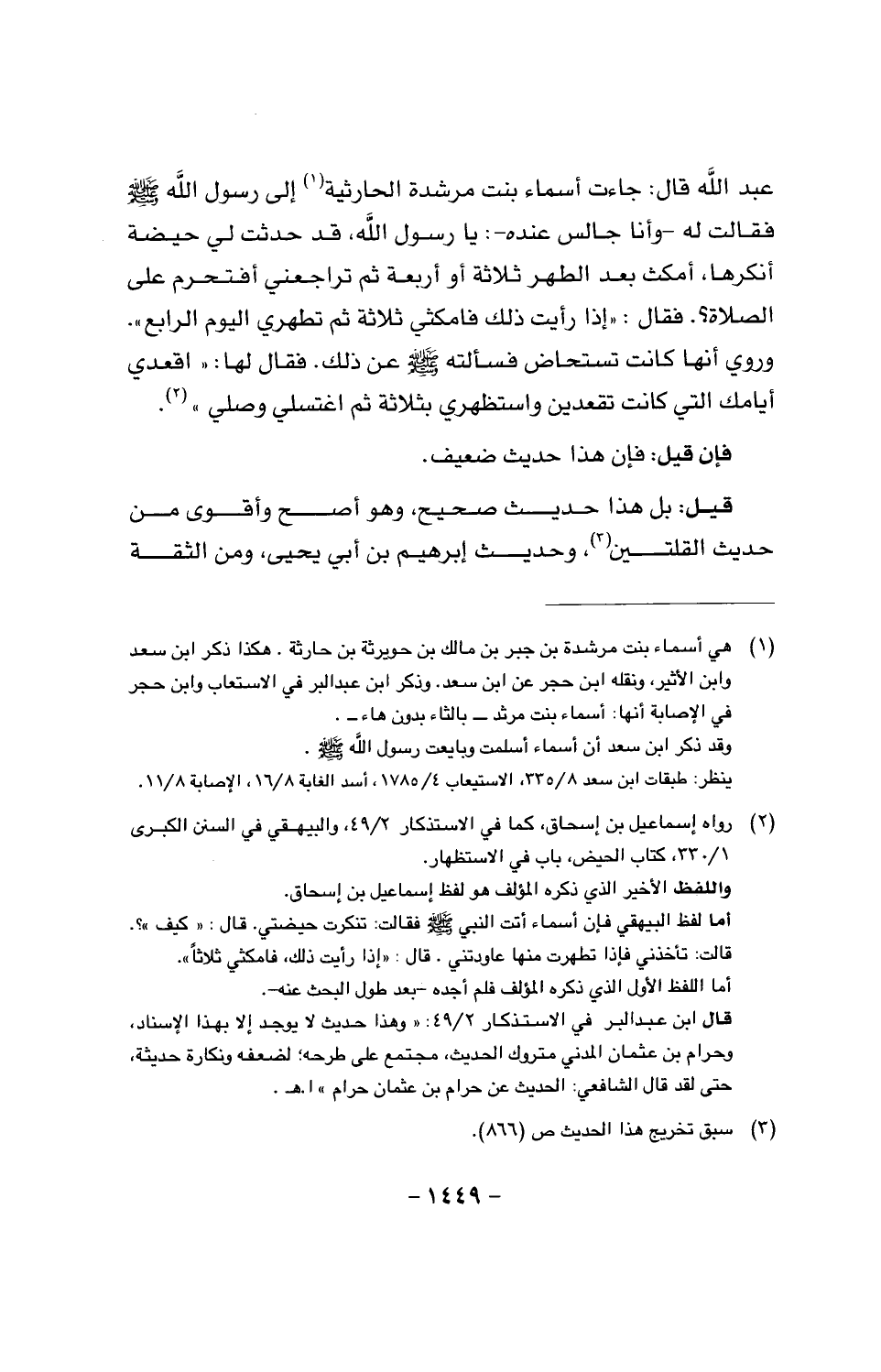 عبد الله قال: جاءت أسماء بنت مرشدة الحارثية إلى رسول الله صَلَّى اللَّهُ عَلَيْهِ وَسَلَّمَ فقالت له - وأنا جالس عنده - يا رسول الله، قد حدثت لي حيضة أنكرها، أمكث بعد الطهر ثلاثة أو أربعة ثم تراجعني أفتحرم على الصلاة؟. فقال: «إذا رأيت ذلك فامكثي ثلاثة ثم تطهري اليوم الرابع».