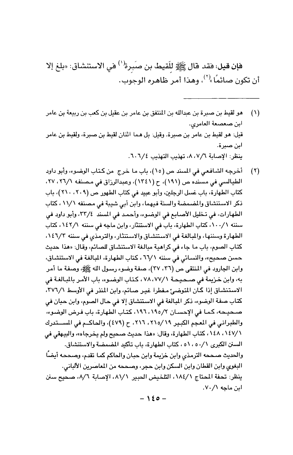 فإن قيل: فقد قال صَلَّى اللَّهُ عَلَيْهِ وَسَلَّمَ لِلَقيط بن صَبِرة في الستنشاق: «بلغ إلا أن تكون صائما»، وهذا أمر ظاهره الوجوب.