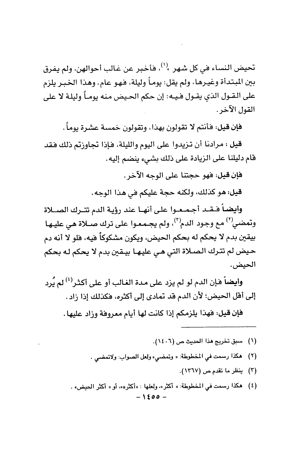 وأيضا فقد أجمعوا على أنها عند رؤية الدم ترك الصلاة وتمضي مع وجود الدم، ولم يجمعوا على ترك صلاة هي عليها بيقين بدم لا يحكم له بحكم الحيض، ويكون مشكوكا فيه، فلولا أنه دم حيض لم تترك الصلاة الذي هي عليها بيقين بدم لا يحكم له بحكم الحيض.