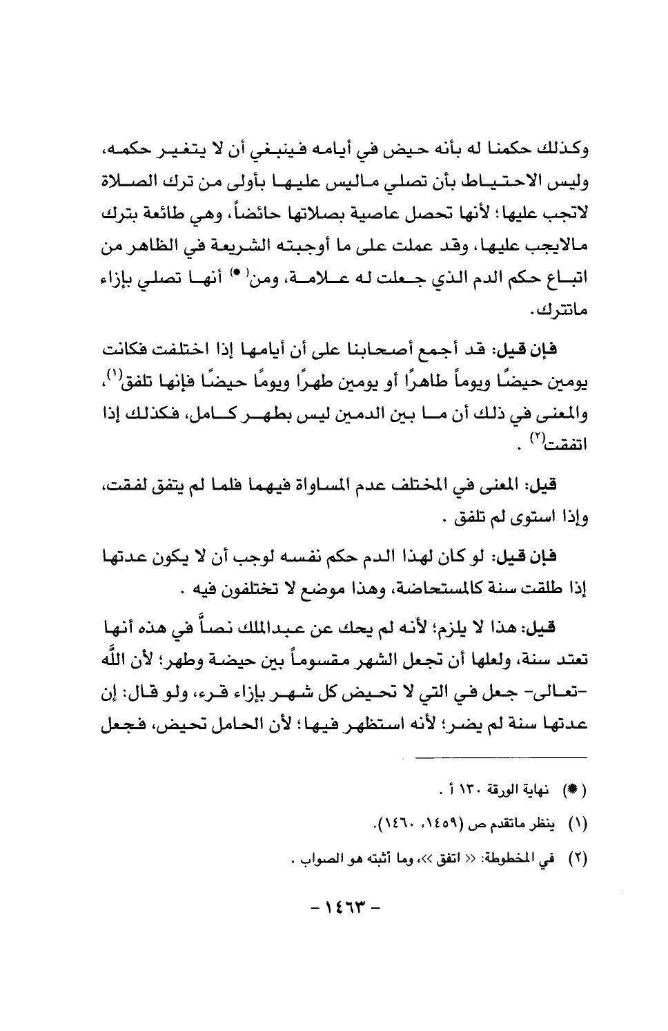 وكذلك حكمنا له بأنه حيض في أيامه فينبغي أن لا يتغير حكمه، وليس الاحتياط بأن تصلي ما ليس عليها بأولى من ترك الصلاة لا تجب عليها؛ لأنها تحصل عاصية بصلاتها حائضا، وهي طائعة بترك ما لا يجب عليها، قد علمت على ما أوجبته الشريعة في الظاهر من اتباع حكم الدم الذي جعلت له علامة، ومن أنها تصلي بإزاء ما ترك.