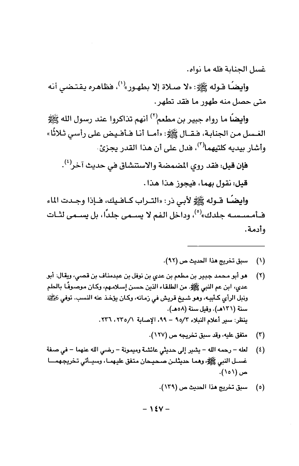 وأيضاً ما رواه جبير بن مطعم أنهم تذاكروا عند رسول الله صَلَّى اللَّهُ عَلَيْهِ وَسَلَّمَ الغسل من الجنابة. فقال صَلَّى اللَّهُ عَلَيْهِ وَسَلَّمَ «أما أنا فأفيض على رأسي ثلاثاً»، وأشار بيديه كلتيهما، فدل على أن هذا القدر يجزئ.