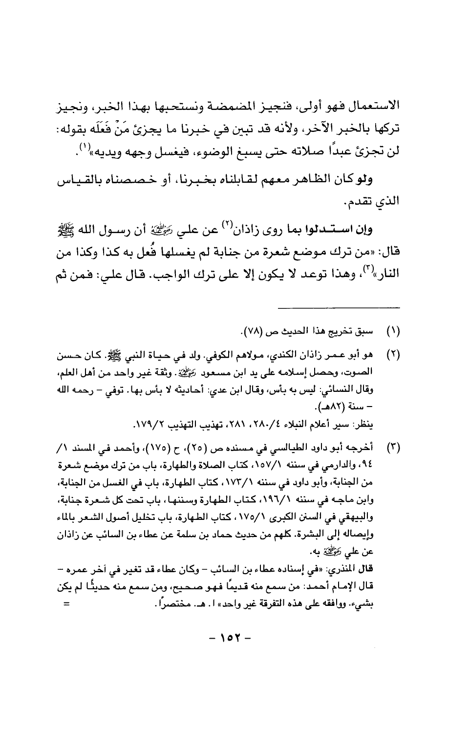 وإن استدلوا بما روى زاذان عن علي رضي الله عنه أن رسول الله صَلَّى اللَّهُ عَلَيْهِ وَسَلَّمَ قال: «من ترك موضع شعرة من جنابة لم يغسلها فُعل به كذا وكذا من النار»، وهذا توعد لا يكون إلا على ترك الواجب، قال علي: فمن ثم