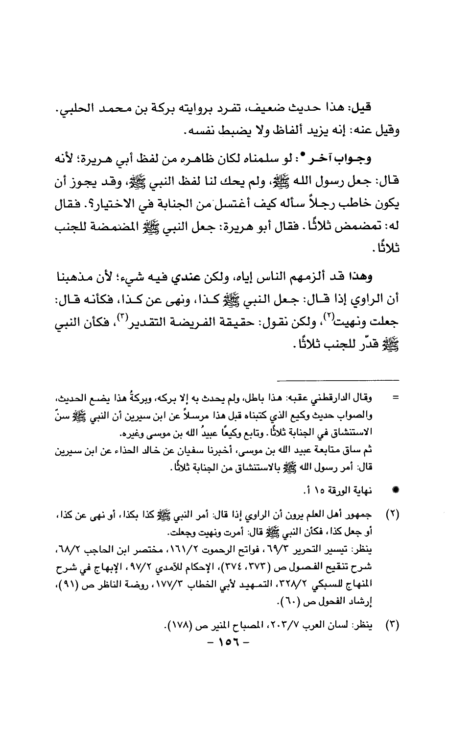 وهذا قد ألزمهم الناس إياه، ولكن عندي فيه شيء؛ لأن مذهبنا أن الراوي إذا قال: جعل النبي صَلَّى اللَّهُ عَلَيْهِ وَسَلَّمَ كذا، ونهى عن كذا، فكأنَّه قال: جعلت ونهيت، ولكن نقول: حقيقة الفريضة التقدير، فكأن النبي صَلَّى اللَّهُ عَلَيْهِ وَسَلَّمَ قدّر للجنب ثلاثاً.