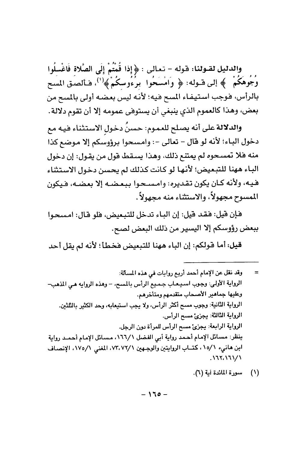 والدليل لقولنا: قوله -تعالى: {إِذَا قُمْتُمْ إِلَى الصَّلَاةِ فَاغْسِلُوا وُجُوهَكُمْ} إلى قوله: {وَامْسَحُوا بِرُءُوسِكُمْ}، فألصق المسح بالرأس، فوجب استيفاء المسح فيه؛ لأنَّه ليس بعضه أولى بالمسح من بعض، وهذا كالعموم الذي ينبغي أن يستوفي عمومه إلا أن تقوم دلالة.