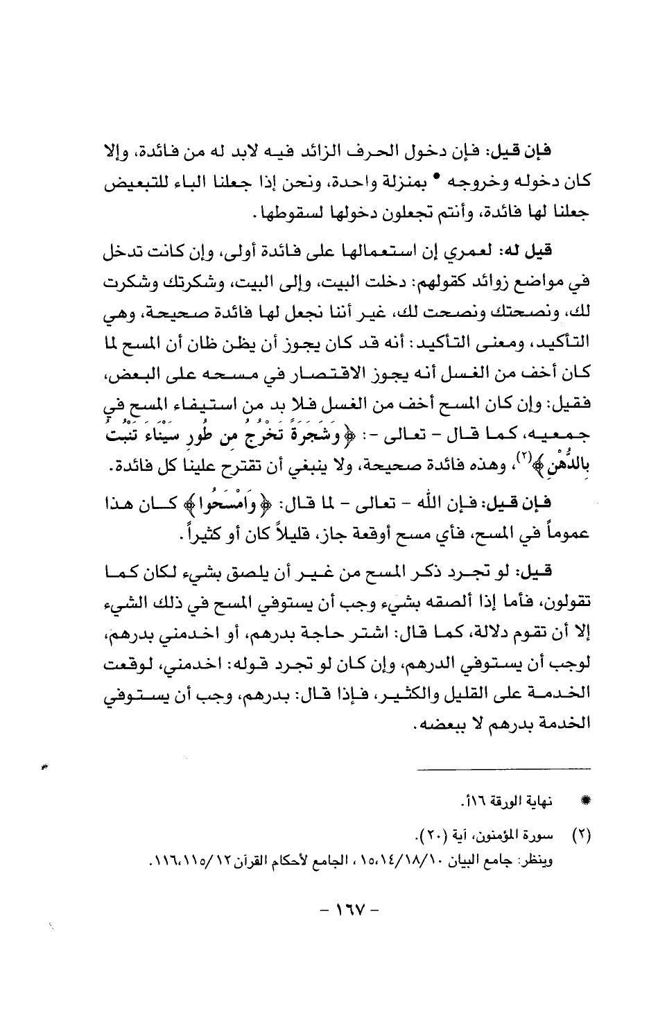 قيل له: لعمري إن استعمالها على فائدة أولى، وإن كانت تدخل في مواضع زوائد كقولهم: دخلت البيت، وشكرتك وشكرت لك، ونصحتك ونصحت لك، غير انَّنَا نجعل لها فائدة صحيحة، وهي التأكيد، ومعنى التأكيد: أنَّه قد كان يجوز أن يظن ظان أن المسح لمت كان أخف من الغسل أنه يجوز الاقتصار في مسحه على البعض.