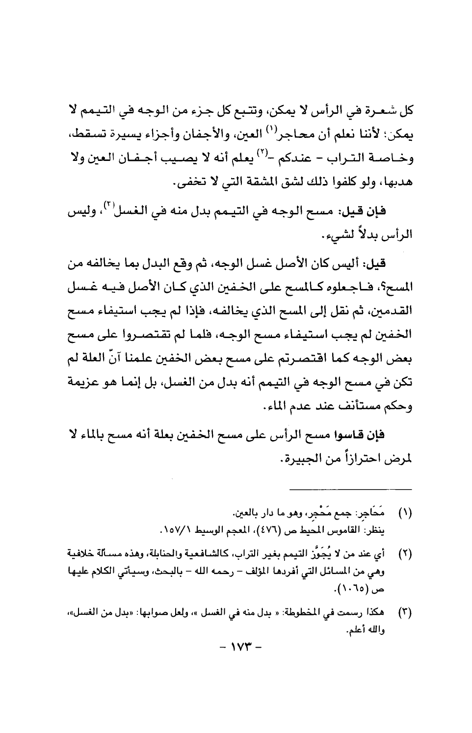 قيل: أليس كان الأصل غسل الوجه؛ ثم وقع البدل بما يخالفه من المسح؟ فاجعلوه كالمسح على الخفين الذي كان الأصل فيه غسل القدمين، ثم نقل إلى المسح الذي يخالفه، فإذا لم يجب استيفاء مسح الخفين لم يجب استيفاء مسح الوجه، فلما لم تقتصروا على مسح بعض الوجه كما اقتصرتم على مسح بعض الخفين علمنا أن العلة لم تكن في مسح الوجه في التيمم أنه بدل من الغسل، بل إنما هو عزيمة وحكم مستأنف عند عدم الماء.
