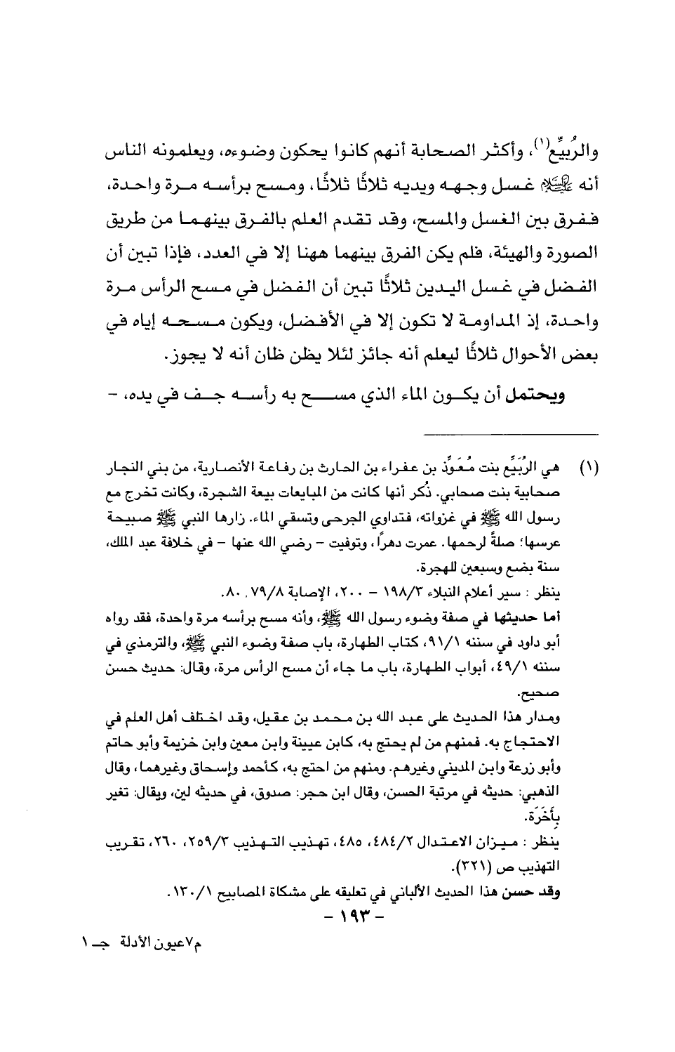 والرُّبيِّع، وأكثر الصحابة أنهم كانوا يحكون وضوءه، ويعلمونه الناس أنه عليه السلام غسل وجهه ويديه ثلاثاً ثلاثاً، ومسح برأسه مرة واحدة، ففرق بين الغسل والمسح، وقد تقدم العلم بالفرق بينهما من طريق الصورة والهيئة، فلم يكن الفرق بينهما ههنا إلا في العدد، فإذا تبين أن الفضل في غسل اليدين ثلاثاً تبين أن الفضل في مسح الرأس مرة واحدة، إذ المداومة لا تكون إلا في الأفضل، ويكون مسحه إياه في بعض الأحوال ثلاثاً ليعلم أنه جائز؛ لئلا يظن ظان أنه لا يجوز.