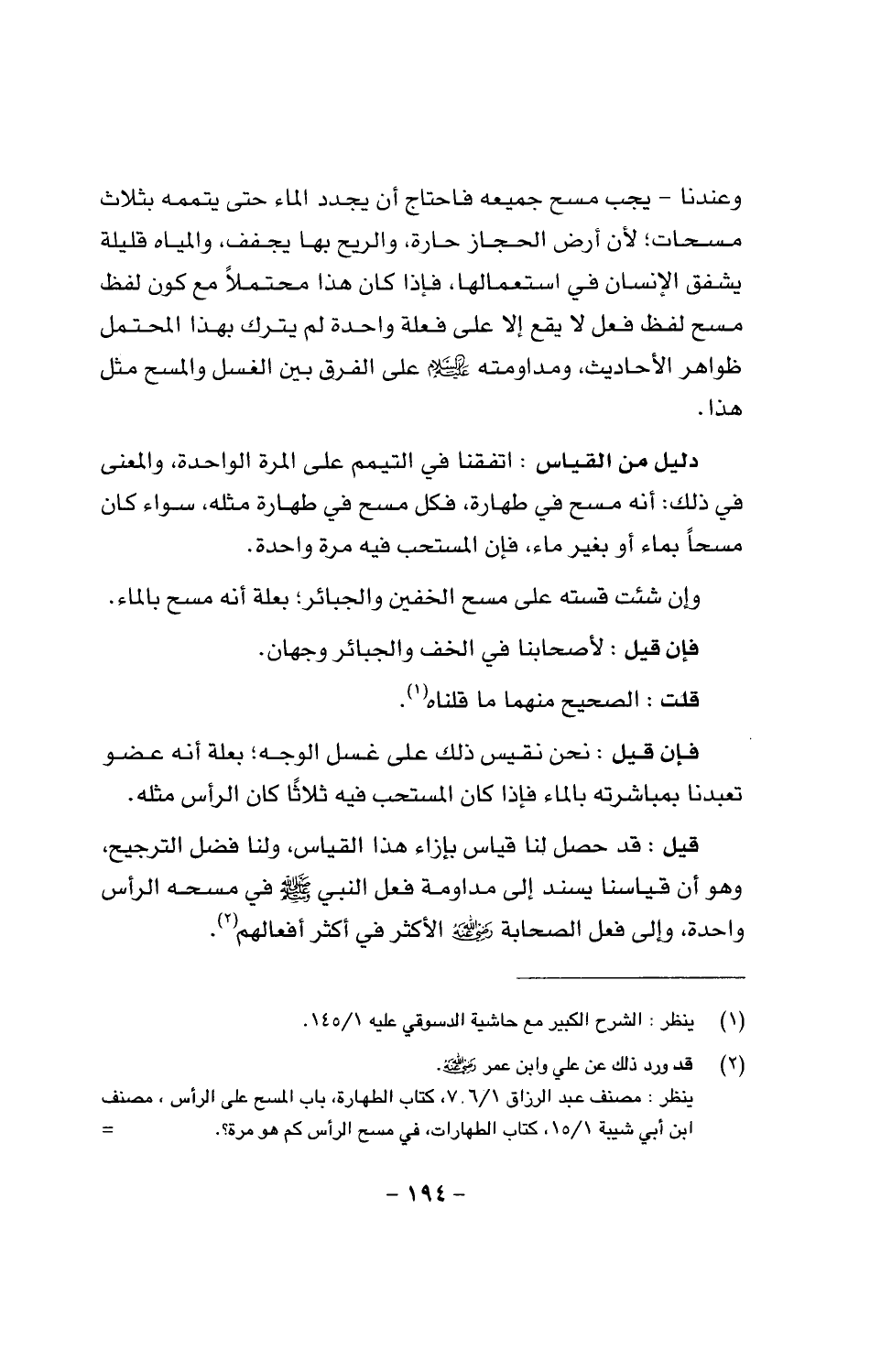 قيل: قد حصل لنا قياس بإزاء هذا القياس، ولنا فضل الترجيح، وهو أن قياسنا يسند إلى مداومة فعل النبي صَلَّى اللَّهُ عَلَيْهِ وَسَلَّمَ في مسحه الرأس واحدة، وإلى فعل الصحابة رضي الله عنهم الأكثر في أكثر أفعالهم.