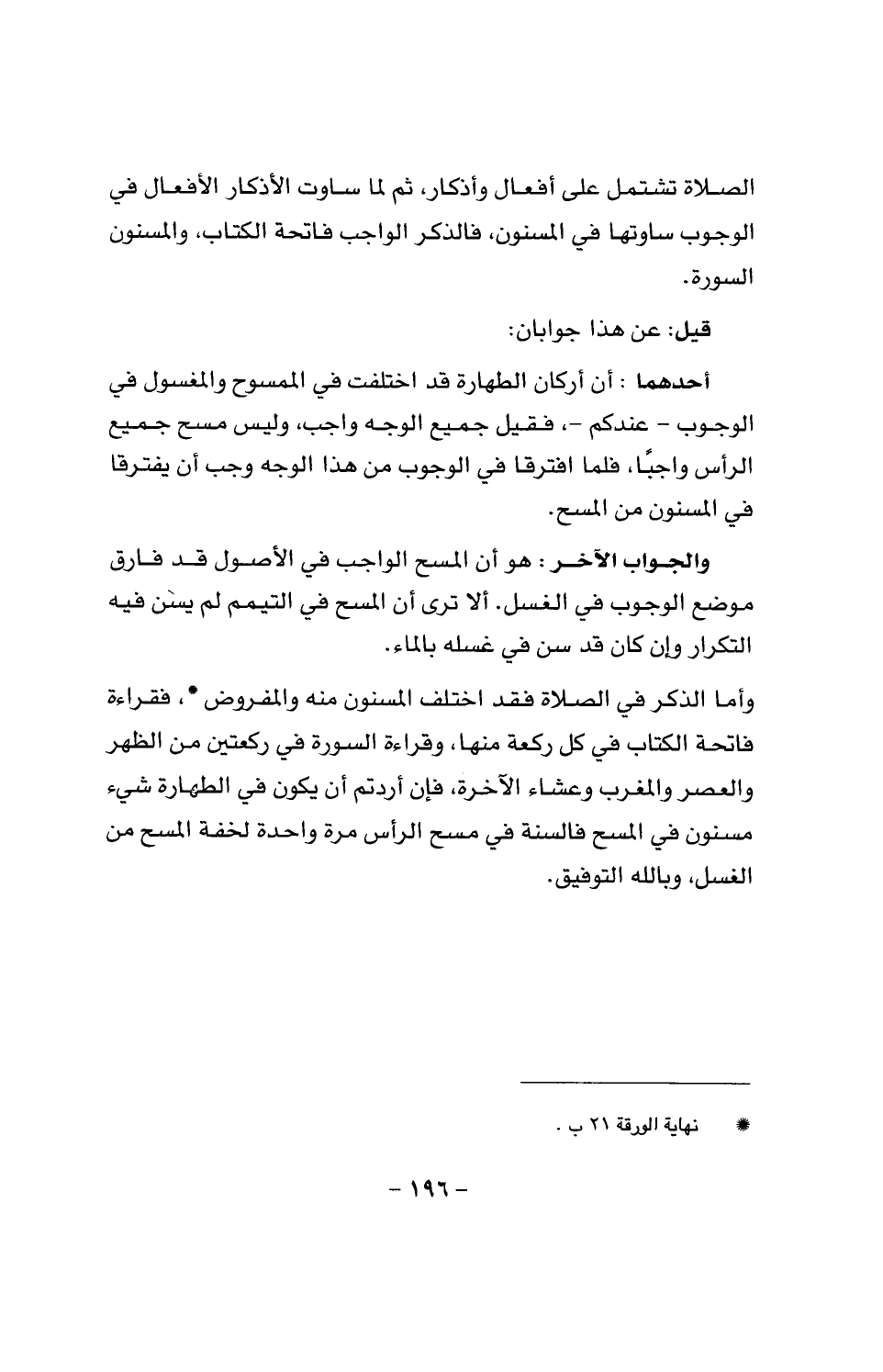 وأما الذكر في الصلاة فقد اختلف المسنون منه والمفروض، فقراءة فاتحة الكتاب في كل ركعة منها، وقراءة السورة في ركعتين من الظهر والعصر والمغرب وعشاء الآخرة، فإن أردتم أن يكون في الطهارة شيء مسنون في المسح فالسنة في مسح الرأس مرة واحدة؛ لخفة المسح من الغسل، وبالله التوفيق.