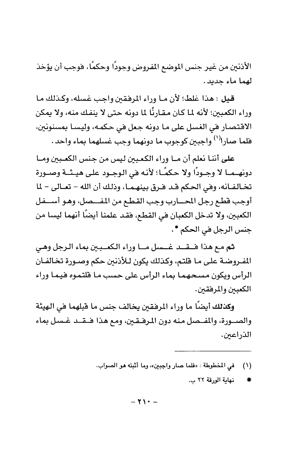 على أننا نعلم أن ما وراء الكعبين ليس من جنس الكعبين وما دونهما لا وجوداً ولا حكماً؛ لأنه في الوجود على هيئة وصورة تخالفانه، وفي الحكم قد فرق بينهما، وذلك أن الله تعالى لما أوجب قطع رجل المحارب وجب القطع من المفصل، وهو أسفل الكعبين، ولا تدخل الكعبان في القطع، فقد علمنا أيضاً أنهما ليسا من جنس الرجل في الحكم.