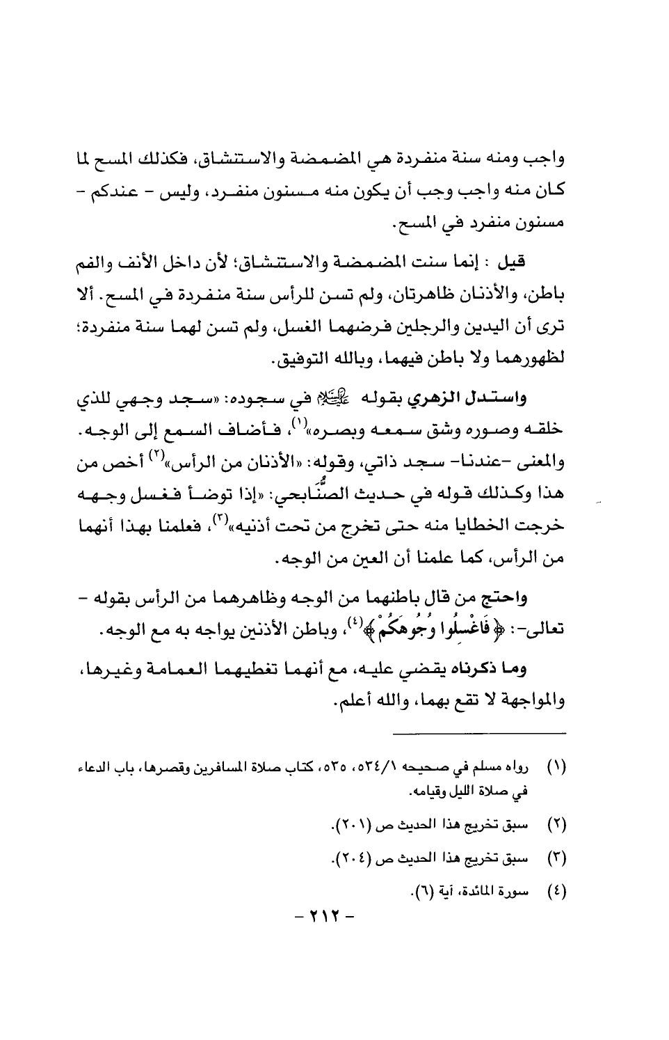 واستدل الزهري بقوله عليه السلام في سجوده: «سجد وجهي للذي خلقه وصوره وشق سمعه وبصره». فأضاف السمع إلى الوجه، والمعنى - عندنا - سنجد ذاتي، وقوله: «الأذنان من الرأس». أخص من هذا، وكذلك قوله في حديث الصُّنَابِحِي: «إذا توضأ فغسل وجهه خرجت الخطايا منه حتى تخرج من تحت أذنيه»، فعلمنا بهذا أنهما من الرأس كما علمنا أن العين من الوجه.