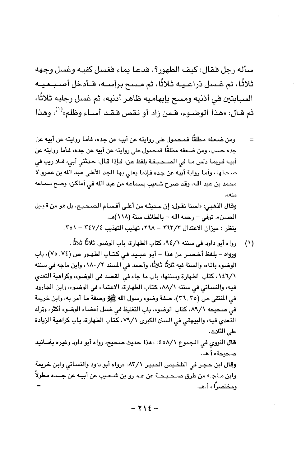 سأله رجل فقال: كيف الطهور. فدعا بماء فغسل كفيه وغسل وجهه ثلاثاً، ثم غسل ذراعيه ثلاثاً، ثم مسح برأسه، فأدخل أصبعيه السبابتين في أذنيه، ومسح بإبهاميه ظاهر أذنيه، ثم غسل رجليه ثلاثاً، ثم قال: «هذا الوضوء، فمن زاد أو نقص فقد أساء وظلم»، وهذا