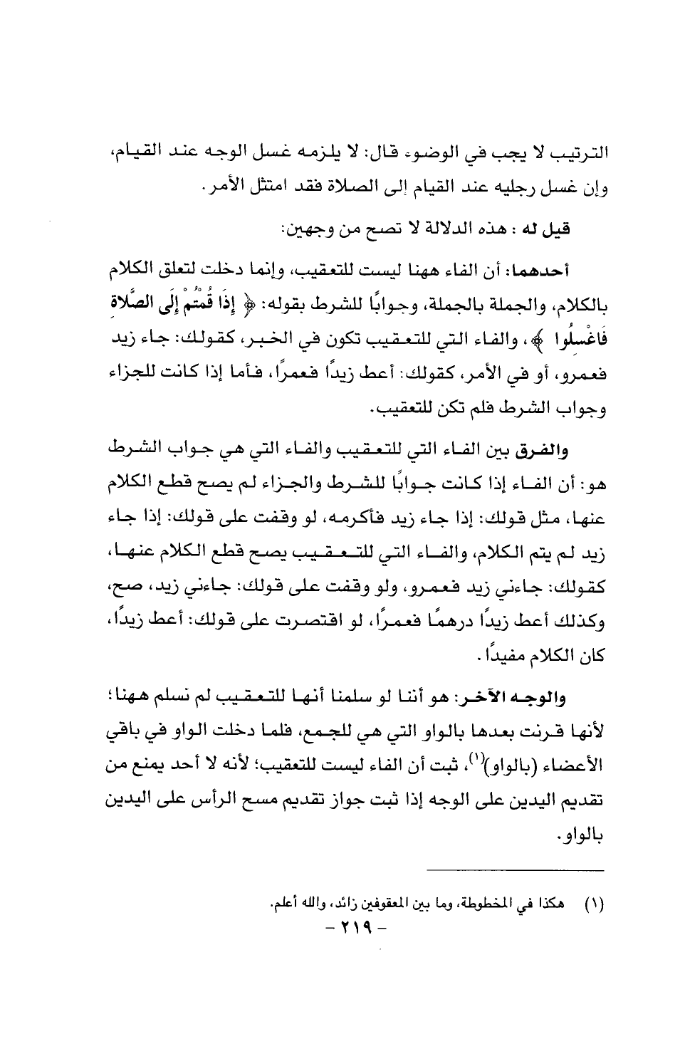 أحدهما: أن الفاء ههنا ليست للتعقيب، وإنما دخلت لتعلق الكلام بالكلام، والجملة بالجملة، وجواباً للشرط بقوله: {إِذَا قُمْتُمْ إِلَى الصَّلَاةِ فَاغْسِلُوا}، والفاء التي للتعقيب تكون في الخبر، كقولك: جاء زيد فعمرو، أو في الأمر، كقولك: فعمراً، فأما إذا كانت للجزاء وجواب الشرط فلم تكن للتعقيب.