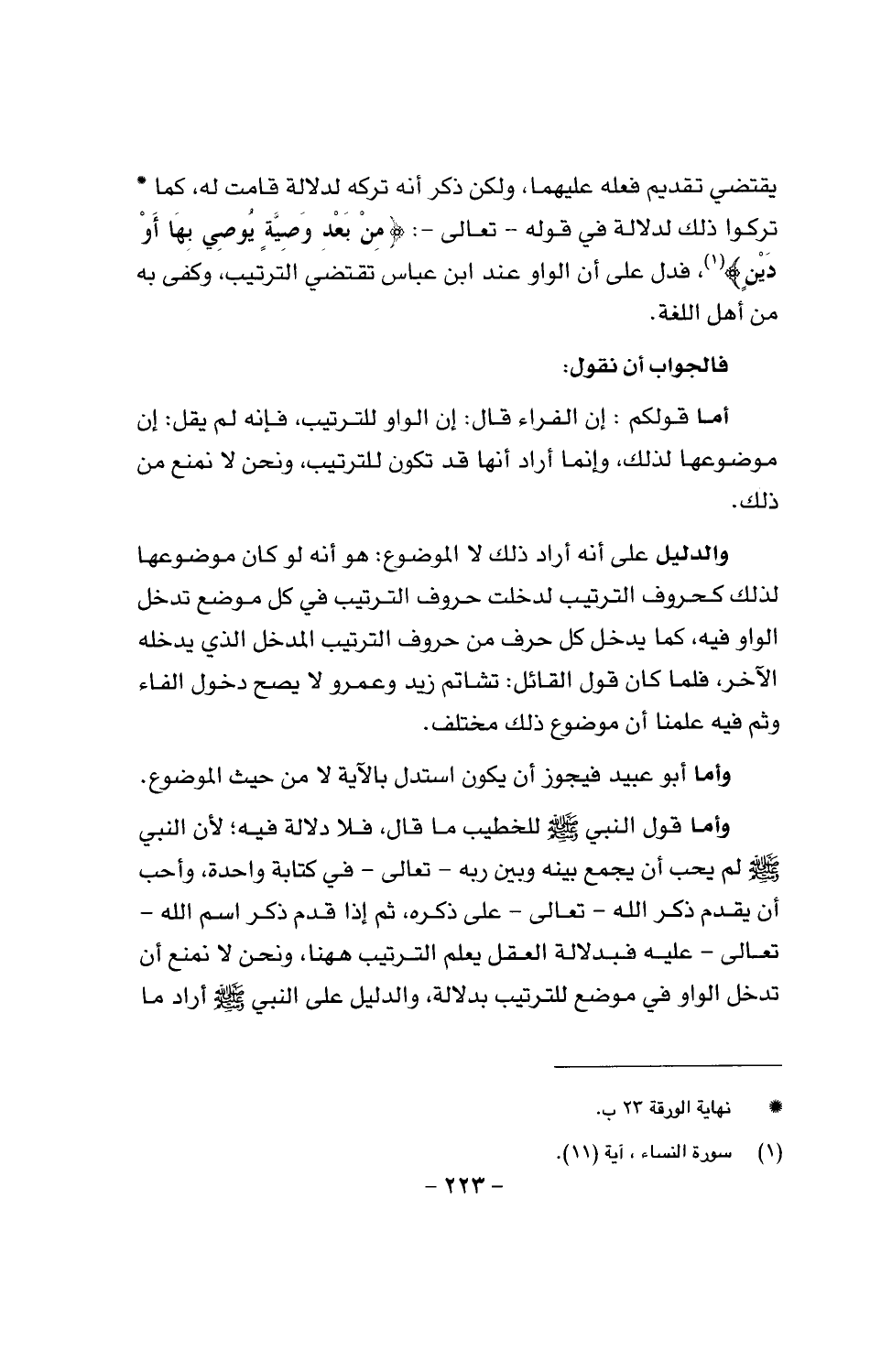 لأما قولكم: إن الفراء قال: إن الواو للترتيب، فإنه لم يقل: إن موضوعها لذلك، وإنما أراد أنها قد تكون للترتيب، ونحن لا نمنع من ذلك.