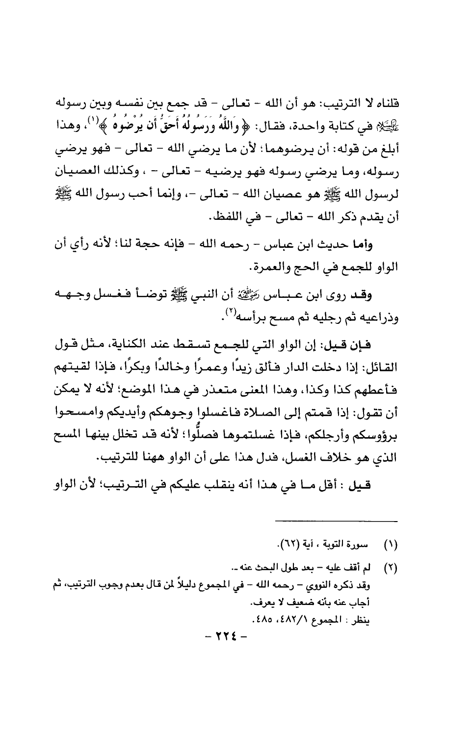 فإن قيل: إن الواو التي للجمع تسقط عند الكناية، مثل قول القائل: إذا دخلت الدار فألق زيداً وعمراً وخالداً وبكراً، فإذا لقيتهم فأعطهم كذا وكذا، وهذا المعنى متعذر في هذا الموضع؛ لأنه لا يمكن أن تقول: إذا قمتم إلى الصلاة فاغسلوا وجوهكم وأيديكم وامسحوا برؤوسكم وأرجلكم، فإذا غسلتموها فصلُّوا؛ لأنه قد تخلل بينها المسح الذي هو خلاف الغسل، فدل على أن الواو ههنا للترتيب.