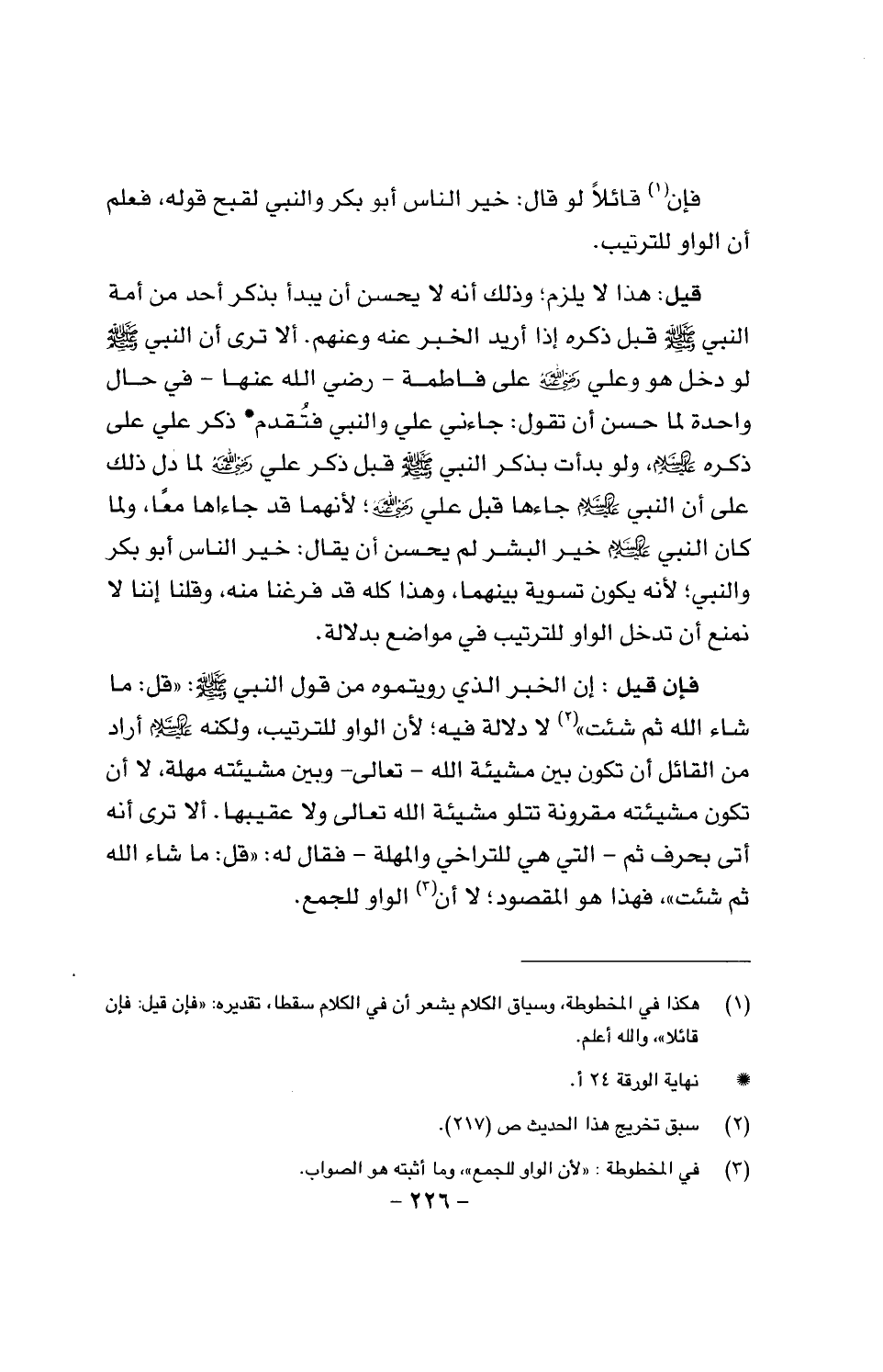 فإن قيل: إن الخبر الذي رويتموه من قول النبي صَلَّى اللَّهُ عَلَيْهِ وَسَلَّمَ: «قل: ما شاء الله ثم شئت». لا دلالة فيه؛ لأن الواو للترتيب، ولكنه عليه السَّلام أراد من القائل أن تكون بين مشيئة الله تعالى وبين مشيئته مهملة، لا أن تكون مشيئته مقرونة تتلو مشيئة الله تعالى، ولا عقيبها. ألا تَرَى أن أتى بحرف ثم - التي هي للتراخي والمهلة - فقال له: «قل: ما شاء الله ثم شئت». فهذا هو المقصود؛ لا أن الواو للجمع.