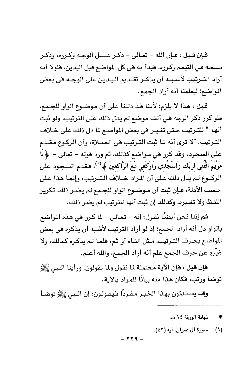قيل: هذا لا يلزم؛ لأننا قد دللنا على أن موضوع الواو للجمع، فلو كرر ذكر الوجه في ألف موضع لم يدل ذلك على الترتيب، ولو ثبت أنها للترتيب حتى تغير في بعض المواضع لما دل ذلك على خلاف الترتيب، ألا ترى أنه لما ثبت الترتيب في الصلاة، وأن الركوع مقدم على السجود، وقد كرر في مواضع كذلك، ثم ورد قوله - تعالى - {يَا مَرْيَمُ اقْنُتِي لِرَبِّكِ وَاسْجُدِي وَارْكَعِي مَعَ الرَّاكِعِينَ}، فقدم السجود على الركوع لم يدل ذلك على أن المراد خلاف الترتيب، وإنما هذا على حسب الأدلة، فإن ثبت أن موضوع الواو للجمع لم يضر ذلك تكرير اللفظ ولا تغييره، وكذلك إن ثبت أنها للترتيب لم يضر ذلك.