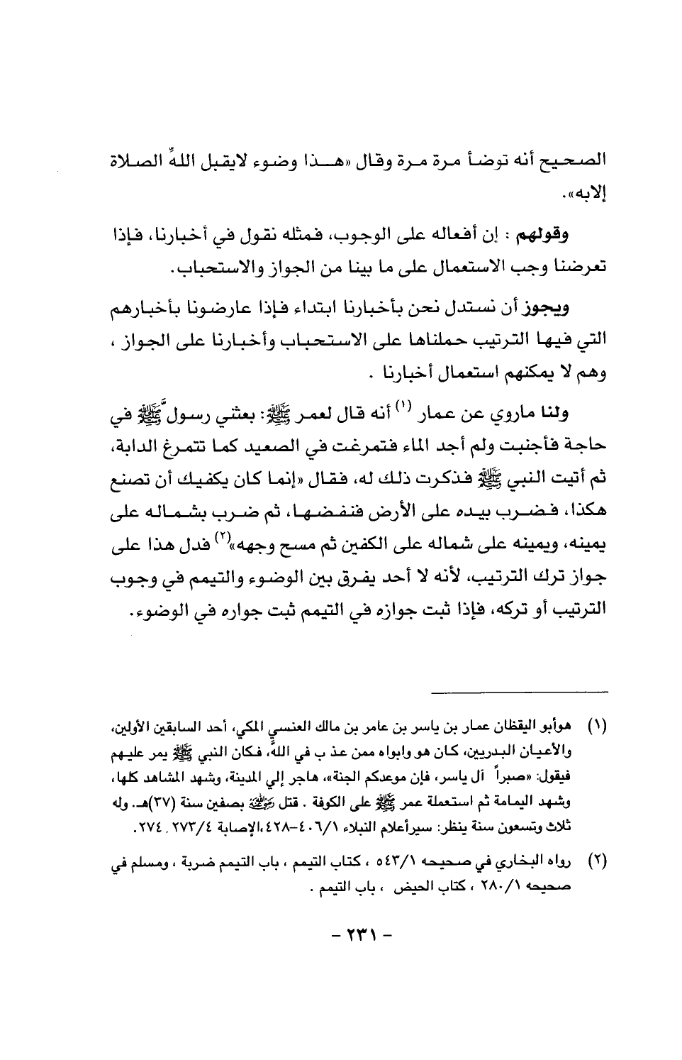 ولنا ما روي عن عمار أنه قال لعمر رضي الله عنه: بعثني رسول الله صَلَّى اللَّهُ عَلَيْهِ وَسَلَّمَ في حاجة فأجنبت ولم أجد الماء فتمرغت في الصعيد كما تتمرغ الدابة، ثم أتيت النبي صَلَّى اللَّهُ عَلَيْهِ وَسَلَّمَ فذكرت ذلك له، فقال: «إنما كان يكفيك أن تصنع هكذا، فضرب بيده على الأرض فنفضها، ثم ضرب بشماله على يمينه، ويمينه على شماله على الكفين، ثم مسح وجهه»، فدل هذا على جواز ترك الترتيب؛ لأنَّه لا أحد يفرق بين الوضوء والتيمم في وجوب الترتيب أو تركه، فإذا ثبت جوازه في التيمم ثبت جوازه في الوضوء.