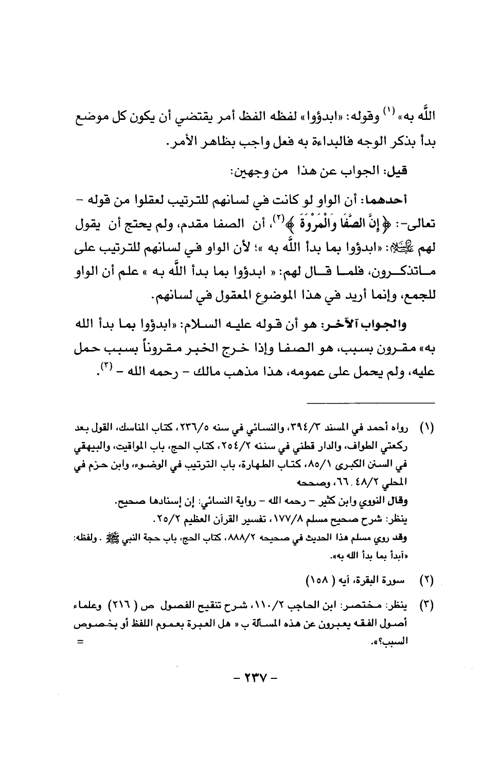 والجواب الآخر: هو أن قوله عليه السلام: «ابدؤوا بما بدأ الله به»، مقرن بسبب، هو الصفا وإذا خرج الخبر مقروناً بسبب حمل عليه، ولم يحمل على عمومه، هذا مذهب مالك - رَحمَه الله -.