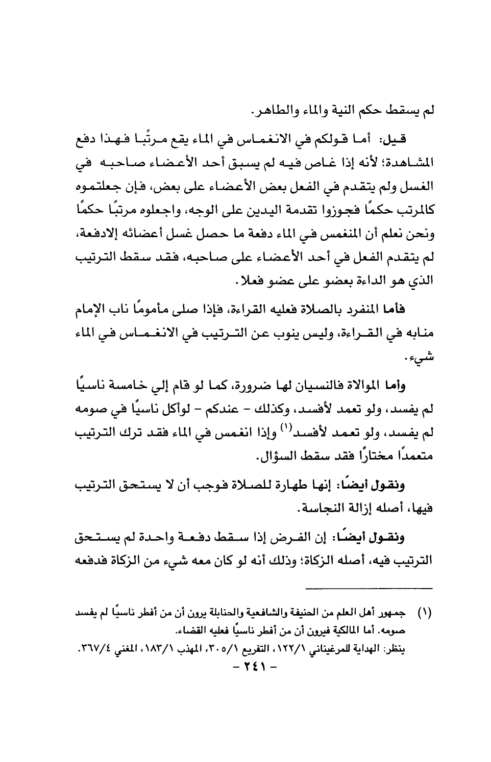 قيل: أما قولكم في الانغماس في الماء يقع مرتباً فهذا دفع المشاهدة؛ لأنَّه إذا غاص فيه لم يسبق أحد الأعضاء صاحبه في الغسل ولم يتقدم في الفعل بعض الأعضاء على بعض، فإن جعلتموه الرتب حكماً فجوزوا تقدمه اليدين على الوجه، واجعلوه مرتباً حككماً ونحن نعلم أن المنغمس في الماء دفعة ما حصل غسل أعضائه إلا دفعة، لم يتقدم الفعل في أحد الأعضاء على صاحبه، فقد سقط الترتيب الذي هو الداءة بعضو على عضو فعلا.