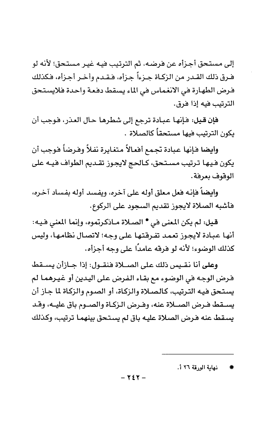 وعلى أنا نقيس ذلك على الصلاة فنقول: إذا جاز أن يسقط فرض الوجه في الوضوء مع بقاء الفرض على الْيَدَيْنِ أو غيرهما لم يستحق فيه الترتيب، كالصلاة والزكاة، أو الصوم والزكاة لما جاز أن يسقط فرض الصلاة عنه، وفرض الزكاة والصوم باق عليه، وقد يسقط عنه فرض الصلاة عليه باق لم يستحق بينهما ترتيب، وكذلك
