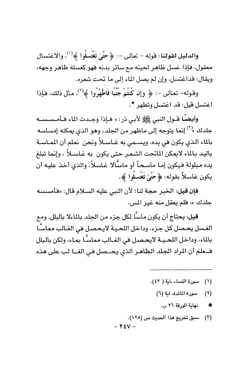 وأيضاً قول النبي صَلَّى اللَّهُ عَلَيْهِ وَسَلَّمَ لأبي ذر: «فإذا وجدت الماء فأمسسه جلدك»، إنما يتوجه إلى ما ظهر من الجلد، وهو الذي يمكنه إمساسه بالماء الذي يكون في يده، ويسمي به غاسلاً ونحن نعلم أن المماسة باليد بالماء لا يمكن الماء تحت الشعر حتى يكون به غاسلاً، وإنما تبلغ يده مبلولة إما ماسحاً أو ماسًّا غاسلاً، والذي أخذ عليه أن يكون غاسلاً بقوله: {حَتَّى تَغْتَسِلُوا}.