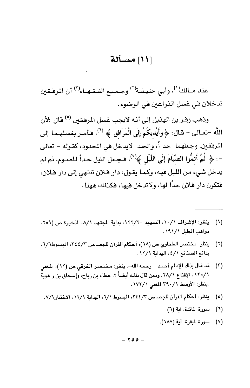 وذهب زفر بن الهذيل إلى أنه لا يجب غسل المرفقين، قال: لأنَّ الله -تعالى - قال: {وَأَيْدِيَكُمْ إِلَى الْمَرَافِقِ}، فأمر بغسلهما إلى المرفقين، وجعلهما حدًّا، والحد لا يدخل في المحدود، كقوله - تعالى -: {ثُمَّ أَتِمُّوا الصِّيَامَ إِلَى اللَّيْلِ}، فجعل الليل حدًّا للصوم، ثم لم يدخل شيء من الليل فيه، وكما يقول: دار فلان تنتهي إلى دار فلان، فتكون دار فلان حدًّا لها، ولا تدخل فيها، فكذلك ههنا.