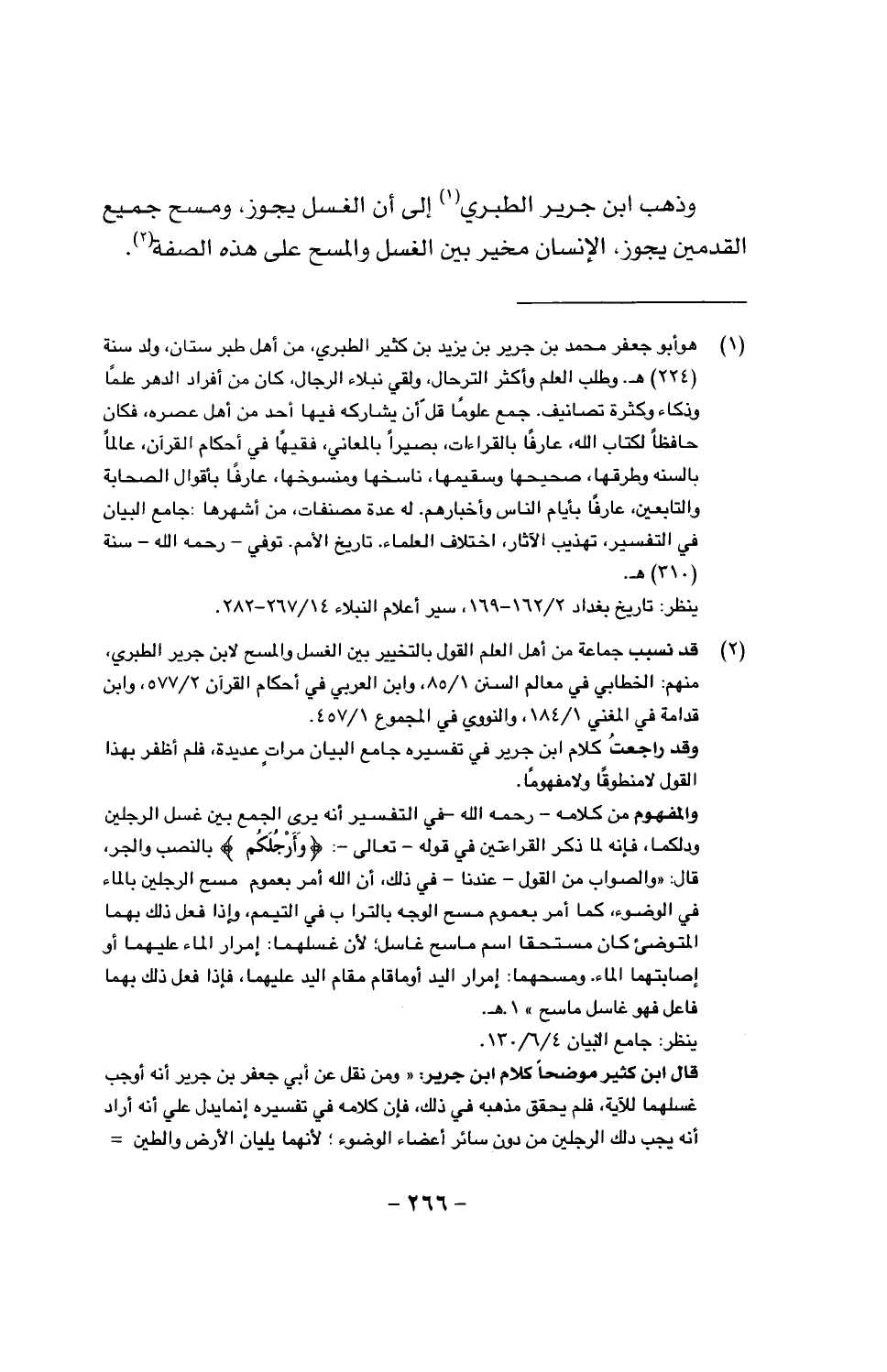 وذهب ابن جرير الطبري إلى أن الغسل يجوز، ومسح جميع القدمين يجوز، الإنسان مخيَّر بين الغسل والمسح على هذه الصفة.