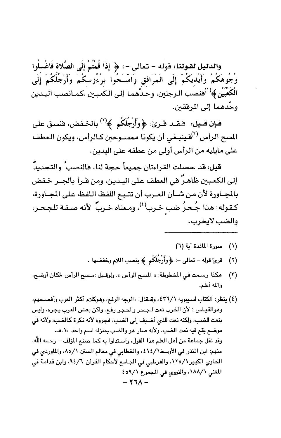 والدليل لقولنا: قوله -تعالى - {إِذَا قُمْتُمْ إِلَى الصَّلَاةِ فَاغْسِلُوا وُجُوهَكُمْ وَأَيْدِيَكُمْ إِلَى الْمَرَافِقِ وَامْسَحُوا بِرُءُوسِكُمْ وَأَرْجُلَكُمْ إِلَى الْكَعْبَيْنِ}، فنصب الرجلين، وحدّهما إلى الكعبين، كما نصب اليدين وحدّهما إلى المرفقين.