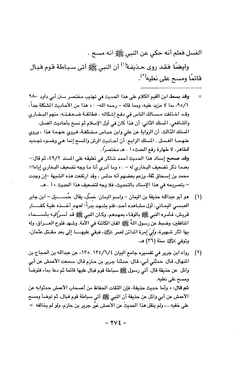 وأيضاً فقد روى حذيفة أن النبي صَلَّى اللَّهُ عَلَيْهِ وَسَلَّمَ أتى سباطة قوم فبال قائماً ومسح على نعليه.