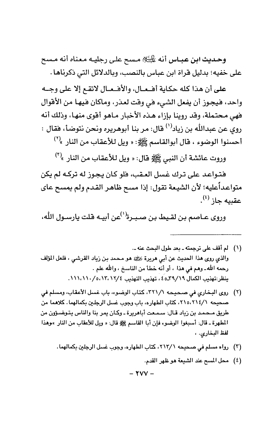 على أن هذا كله حكاية أفعال، والأفعال لا تقع إلا على وجه واحد، فيجوز أن يفعل الشيء في وقت لعذر، وما كان فيها من الأقوال فهي محتملة، وقد روينا بإزاء هذه الأخبار ما هو أقوى منها، وذلك انَّه روي عن عبد الله بن زياد، قال: مر بنا أبو هريرة ونحن نتوضأ، فقال: أحسنوا الوضوء، قال أبو القاسم صَلَّى اللَّهُ عَلَيْهِ وَسَلَّمَ: «ويل للأعقاب من النار».