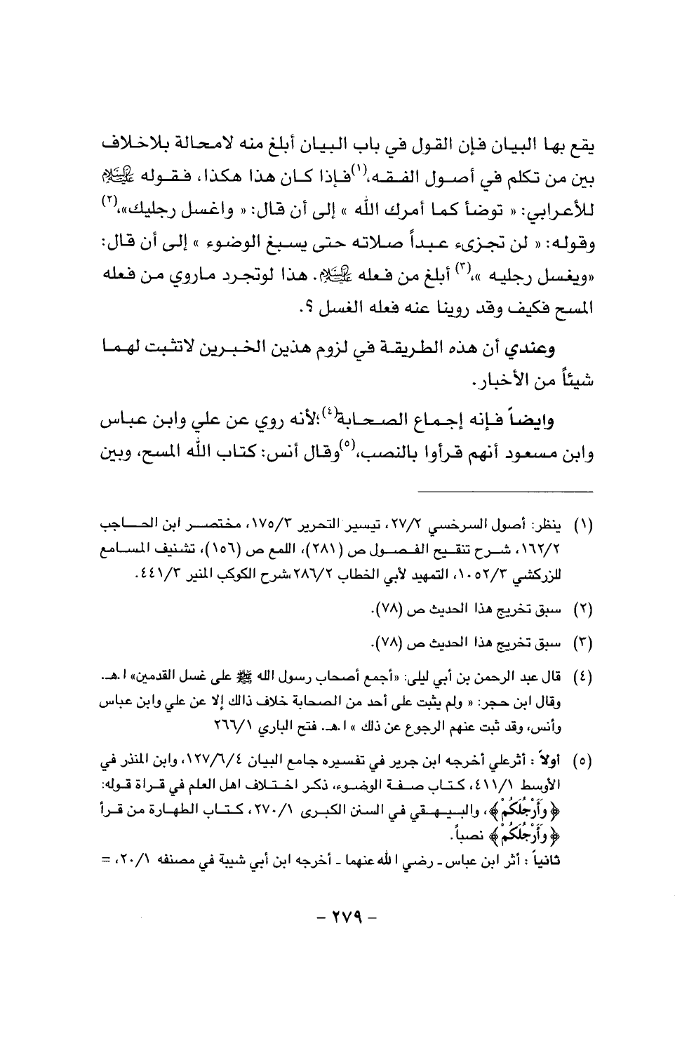 وأيضاً فإنَّه إجماع الصحابة لأنه روي عن علي وابن عباس وابن مسعود أنهم قرأوا بالنصب، وقال انس: كتاب الله المسح، وبين