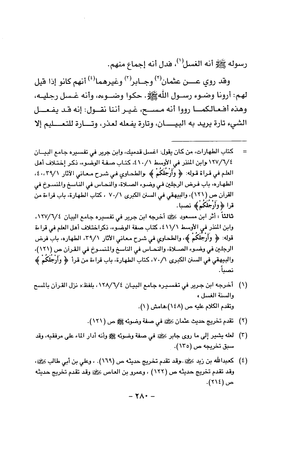وقد روي عن عثمان وجابر وغيرهما لأنهم كانوا إذا قيل لهم: أرونا وضوء رسول الله صَلَّى اللَّهُ عَلَيْهِ وَسَلَّمَ حكوا وضوءه، وأنه غسل رجليه، وهذه أفعالكما رووا أنه مسح، غير أننا نقول: إنه قد يفعل الشيء تارة يريد به البيان، وتارة يفعله لعذر، وتارة للتعليم إلا