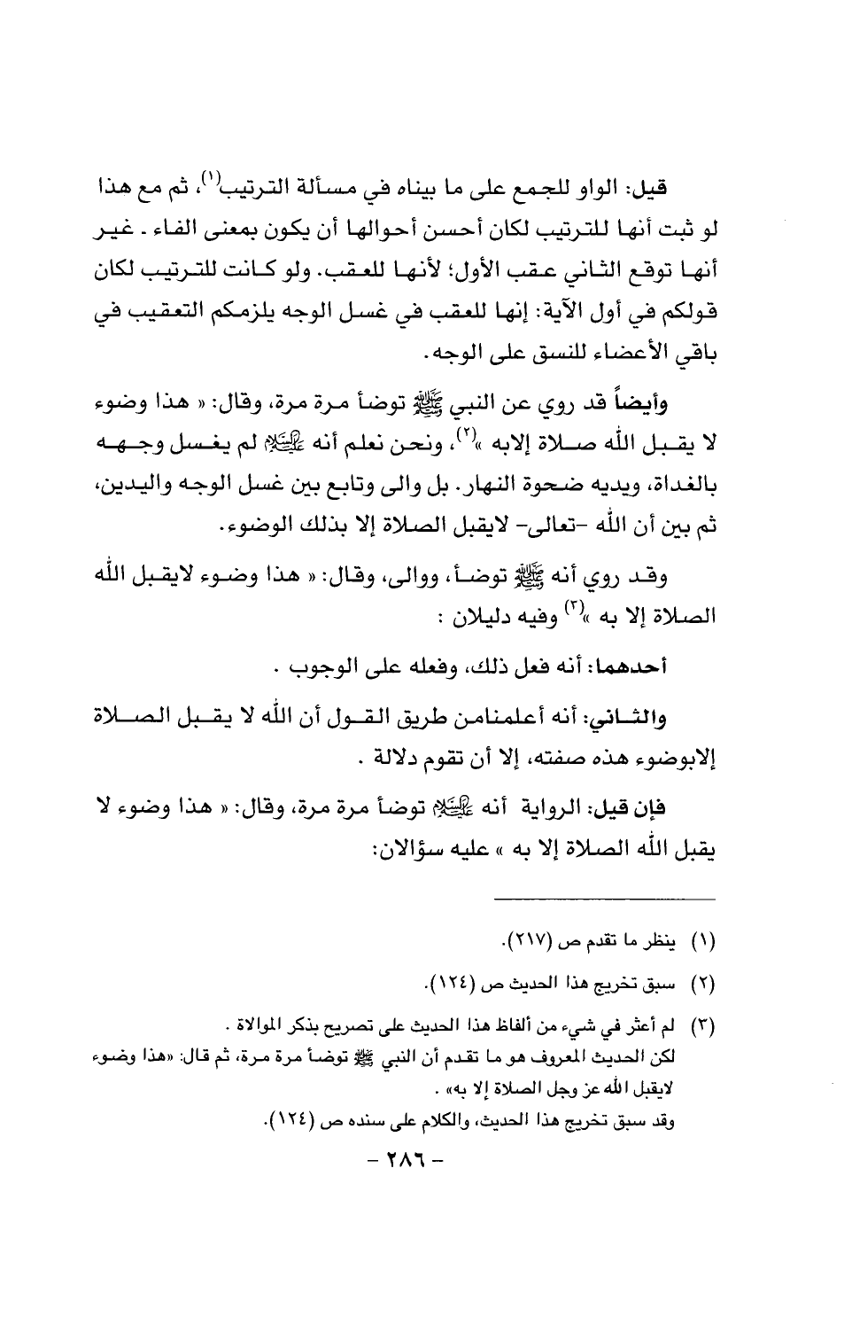 وقد روي أنه صَلَّى اللَّهُ عَلَيْهِ وَسَلَّمَ توضأ، ووالى، وقال: «هذا وضوء لاي قبل الله الصاة إلا به»، وفيه دليلان: