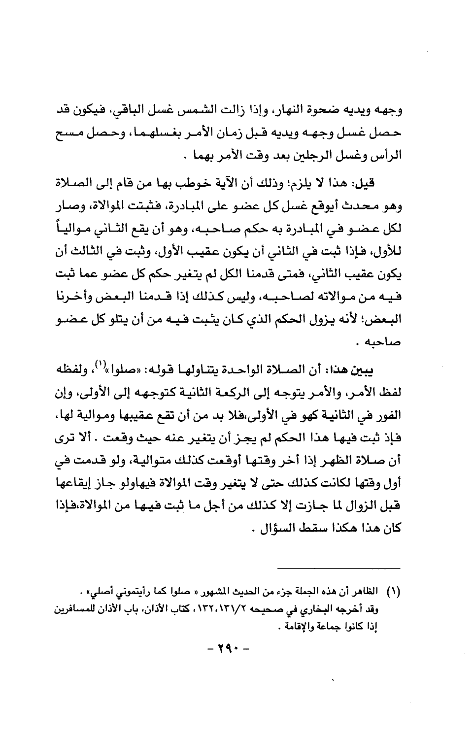 يبين هذا: أن الصلاة الواحدة يتناولها قوله: «صلوا»، ولفظه لفظ الأمر، والأمر يتوجه إلى الركعة الثانية كتوجهه إلى الأولى، وإن الفور في الثانية كهو في الأولى، فلا بد من أن تقع عقيبها ومواليه لها، فإذا ثبت فيها هذا الحكم لم يجز أن يتغير عنه حيث وقعت. ألا ترى أن صلاة الظهر إذا أخر وقتها أوقعت كذلك، متوالية، ولو قدمت في أول وقتها لكانت كذلكن حتى لا يتغير وقت الموالاة فيها ولو جاز إيقاعها قبل الزوال لما جازت إلا كذلك من أجل ما ثبت فيها من الموالاة، فإذا كان هذا هكذا سقط السؤال.