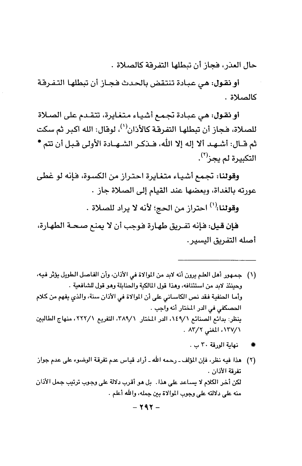 أو نقول: هي عبادة تجمع أشياء متغايرة، تتقدم على الصلاة للصلاة، فجاز أن تبطلها التفرقة كالأذان، لو قال: الله أكبر ثم سكت ثم قال: أشهد ألا إله إلا الله، فذكر الشهادة الأولى قبل أن تتم التكبيرة لم يجز.