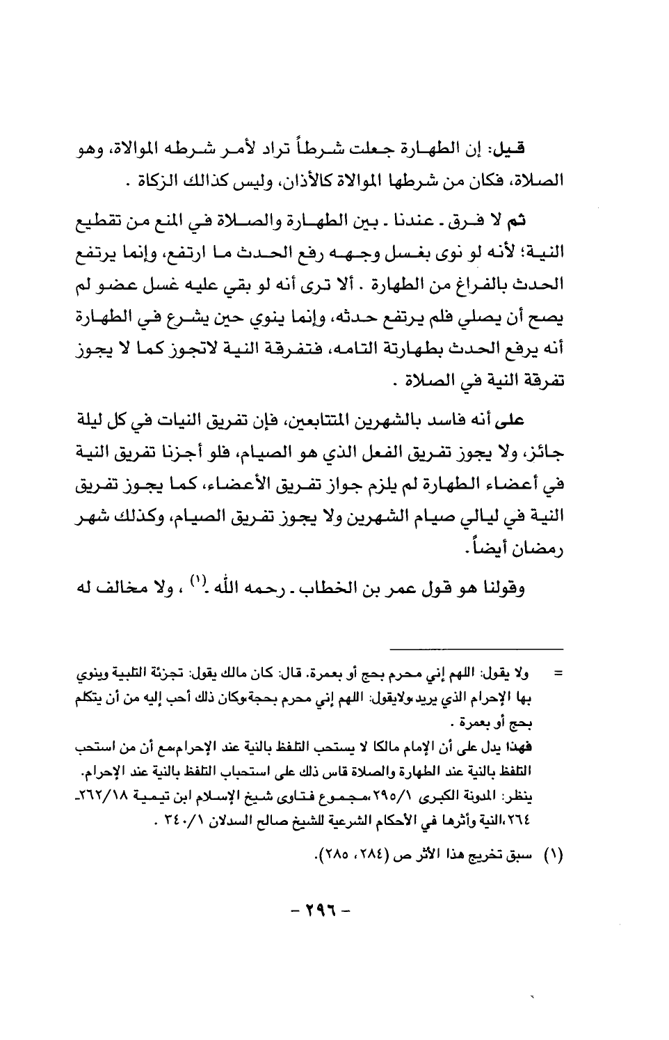ثم لا فرق -عندنا - بين الطهارة والصلاة في المنع من تقطيع النية؛ لأنَّه لو نوى بغسل وجهه رفع الحدث ما ارتفع، وإنما يرتفع الحدث بالفراغ من الطهارة، ألا ترى أنه لو بقي عليه غسل عضو لم يصح أن يصلي فلم يرتفع حدثه، وإنَّمَا ينوي حين يشرع في الطهارة أنه يرفع الحدث بطهارته التامة، فتفرقة النية لا تجوز كما لا يجوز تفرقة النية في الصلاة.