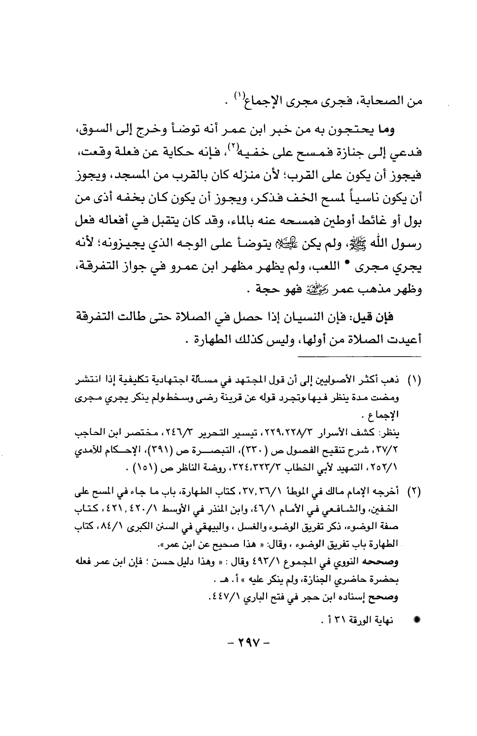 وما يحتجون به من خبر ابن عمر أنَّه توضأ وخرج إلى السوق، فدعي إلى جنازة فمسح على خفيه، فإنه حكاية عن فعلة وقعت، فيجوز أن يكون ناسياً لمح الخف فذكر، ويجوز أن يكون كان بخفه أذى من بول أو غائط أو طين فمسحه عنه بالماء، وقد كان يتقبل في أفعاله فعل رسول الله صَلَّى اللَّهُ عَلَيْهِ وَسَلَّمَ ولم يكن عليه السلام يتوضأ على الوجه الذي يجيزونه؛ لأنَّه يجري مجرى اللعب، ولم يظهر مظهر ابن عمرو في جواز التفرقة، وظهر مذهب عمر رضي الله عنه فهو حجة.