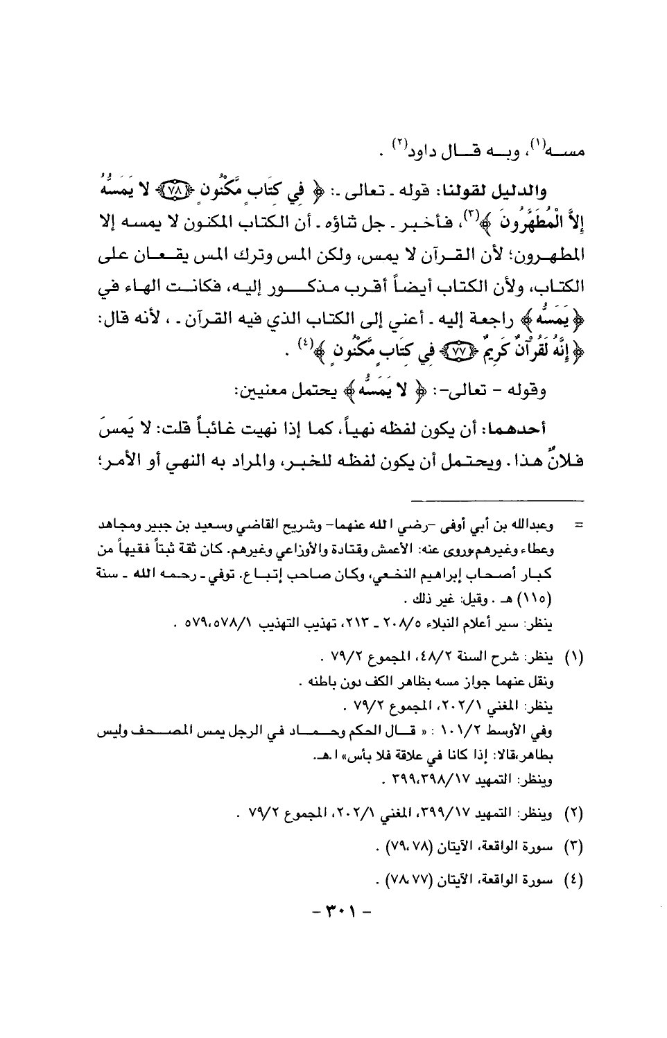 والدليل لقولنا: قوله -تعالى - {فِي كِتَابٍ مَكْنُونٍ (78) لَا يَمَسُّهُ إِلَّا الْمُطَهَّرُونَ}، فأخبر -جل ثناؤه - أن الكتاب المكنون لا يمسه إلا المطهرون؛ لأنَّ القرآن لا يمس، ولكن المس وترك المس يقعان على الكتاب، ولن الكتاب أيضاً أقرب مذكور إليه، فكانت الهاء في {يَمَسُّهُ}، راجعة غليه -أعني إلى الكتاب الذي فيه القرآن -، لأنه قال: {إِنَّهُ لَقُرْآنٌ كَرِيمٌ (77) فِي كِتَابٍ مَكْنُونٍ}.