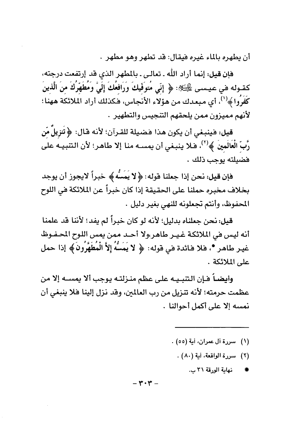 وأيضاً فإن التنبيه على عظم منزلته يوجب ألا يمسه إلا من عظمت حرمته؛ لأنه تنزيل من رب العالمين، وقد نزل إلينا فلا ينبغي أن نمسه إلا على أكمل أحوالنا.